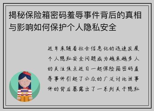 近年来,随着社会信息化的迅速发展,个人隐私安全问题成为越来越多人的关注焦点。近日,一起“保险箱密码羞辱事件”引起了公众的广泛讨论,该事件的背后暴露出了一系列关于隐私保护、信息泄露及其带来的社会影响的深刻问题。文章将从事件的真相、对社会的影响、如何保护个人隐私安全等几个方面进行详细阐述,并提出相应的防范措施。在全球信息化和数字化的背景下,个人隐私面临着空前的挑战,如何有效保护自己的隐私不被泄露,已经成为了每个人必须重视的问题。本文旨在通过解析这一事件,引导公众对隐私保护的重视,并提出一些切实可行的隐私安全防护措施。